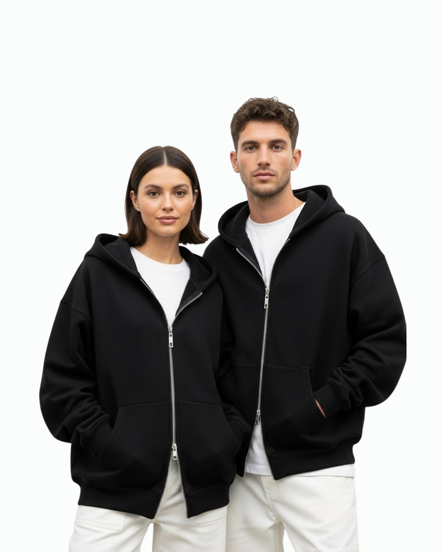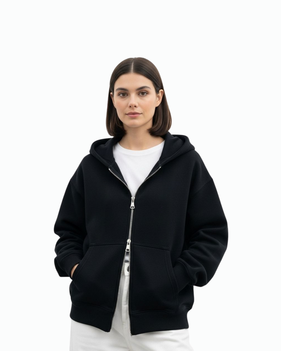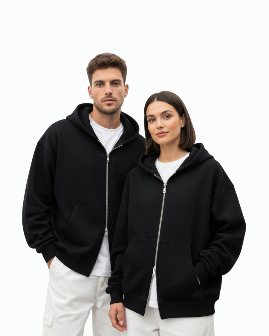 Oversized black zipper hoodie made from soft, 100% fabric. unisex with a comfortable fit, durable zipper — perfect for everyday casual and streetwear outfits.