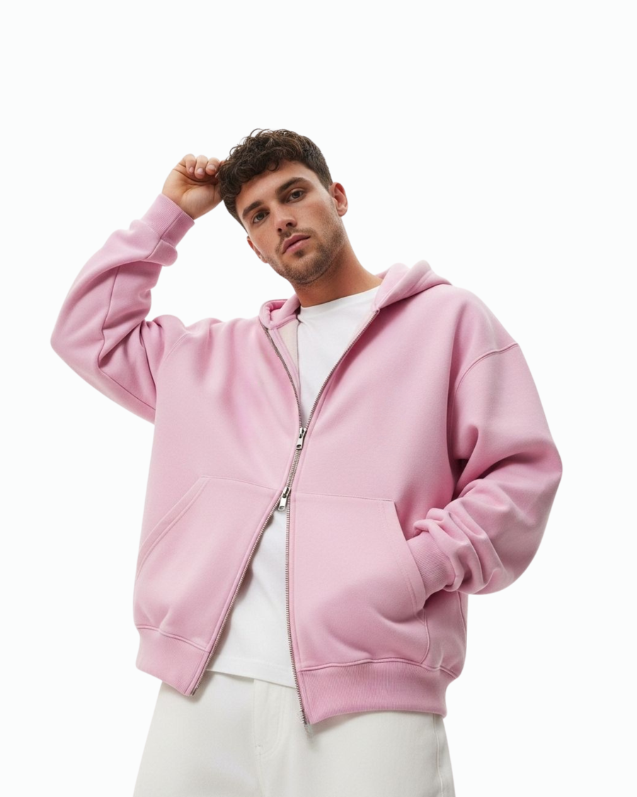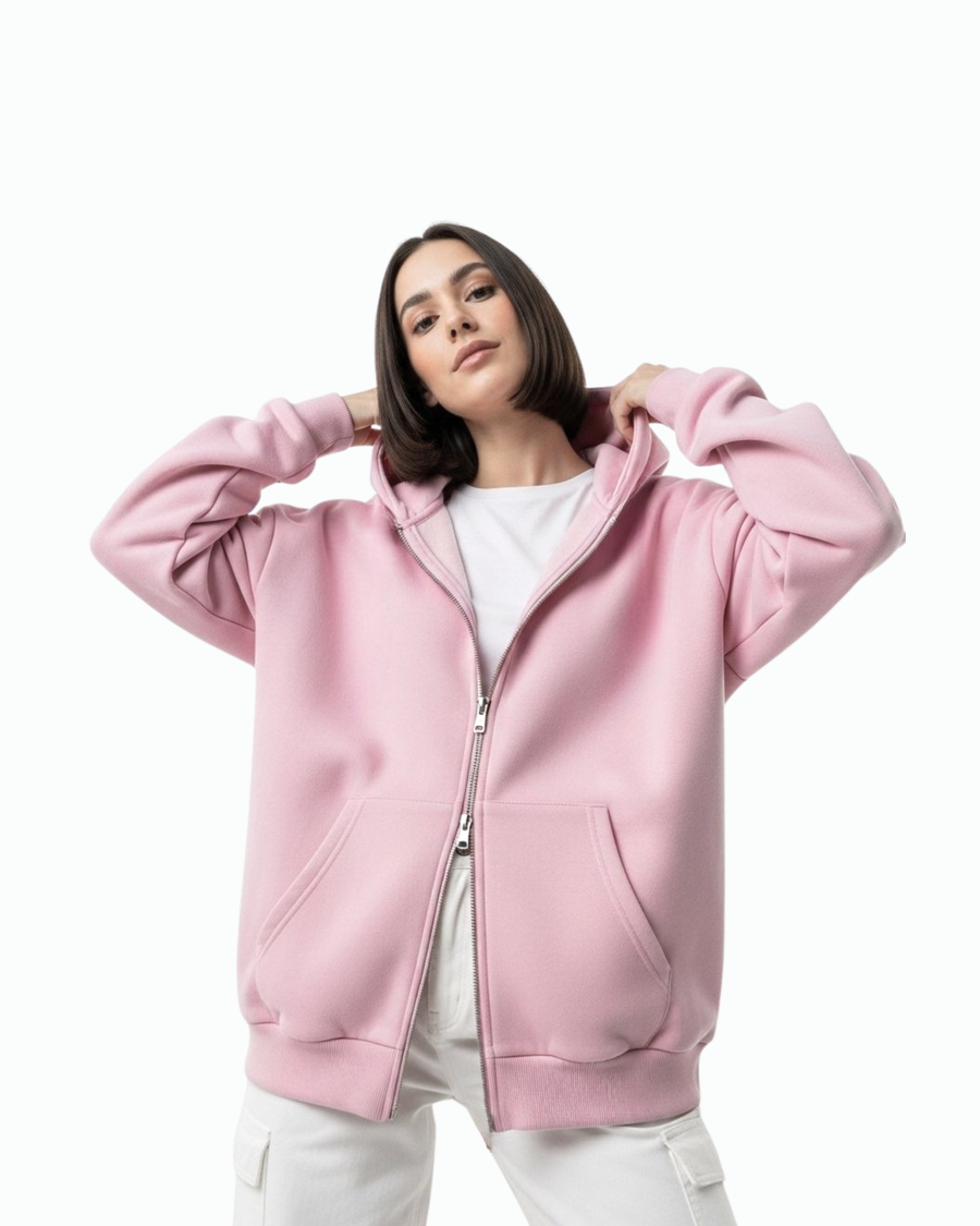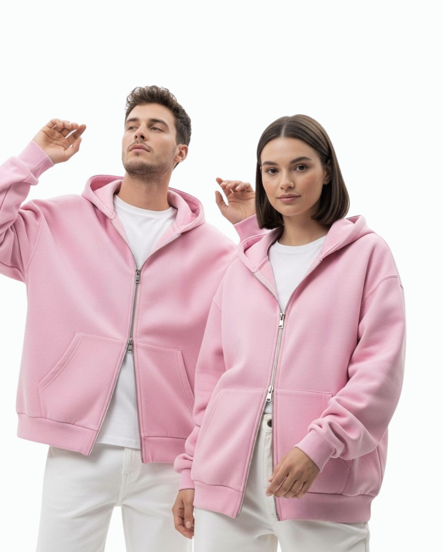 Oversized pink zipper hoodie made from soft, 100% fabric. unisex with a comfortable fit, durable zipper — perfect for everyday casual and streetwear outfits.