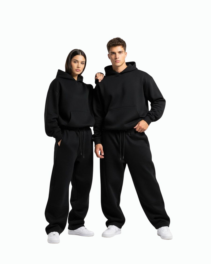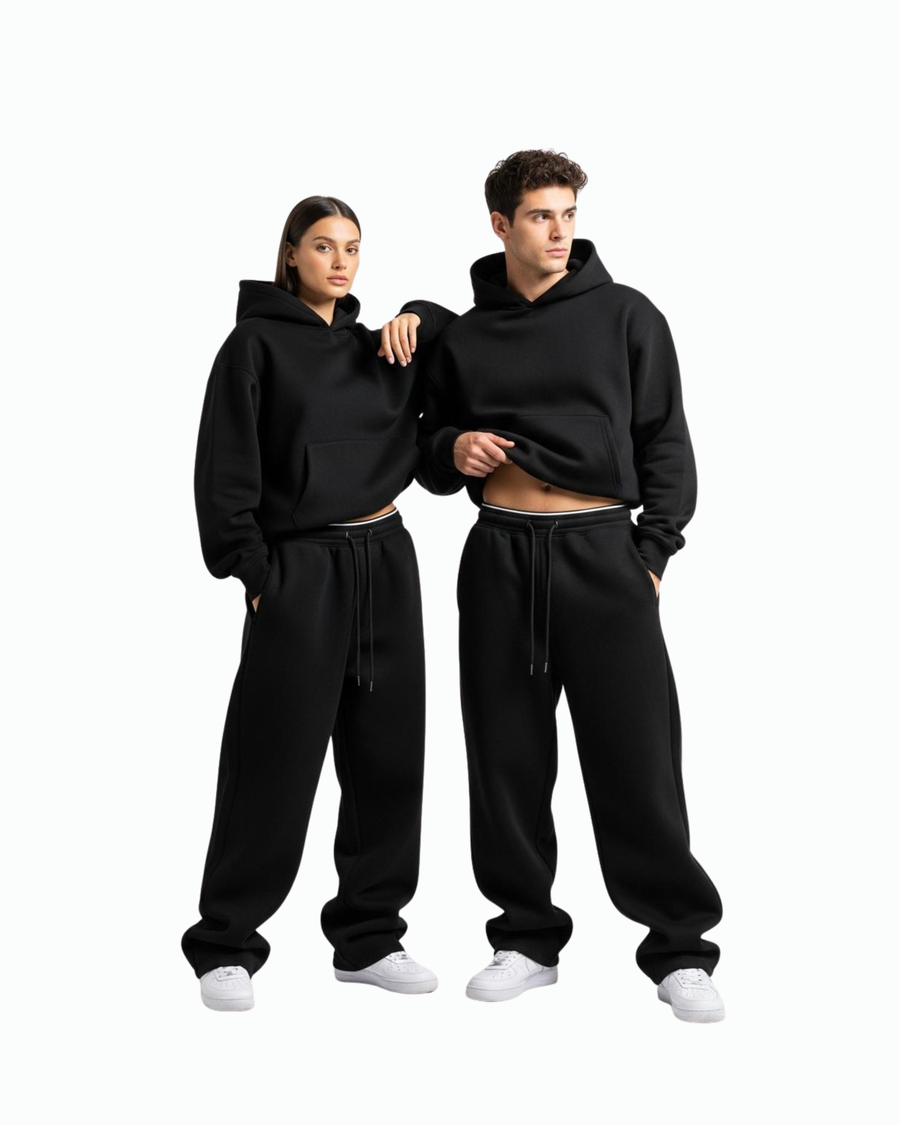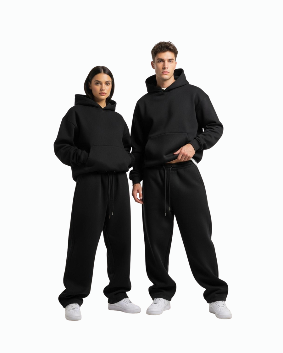Discover the Black Oversized Hoodie & Sweatpants Set—premium 100% cotton fabric, unisex fit, perfect for winter comfort and streetwear style.